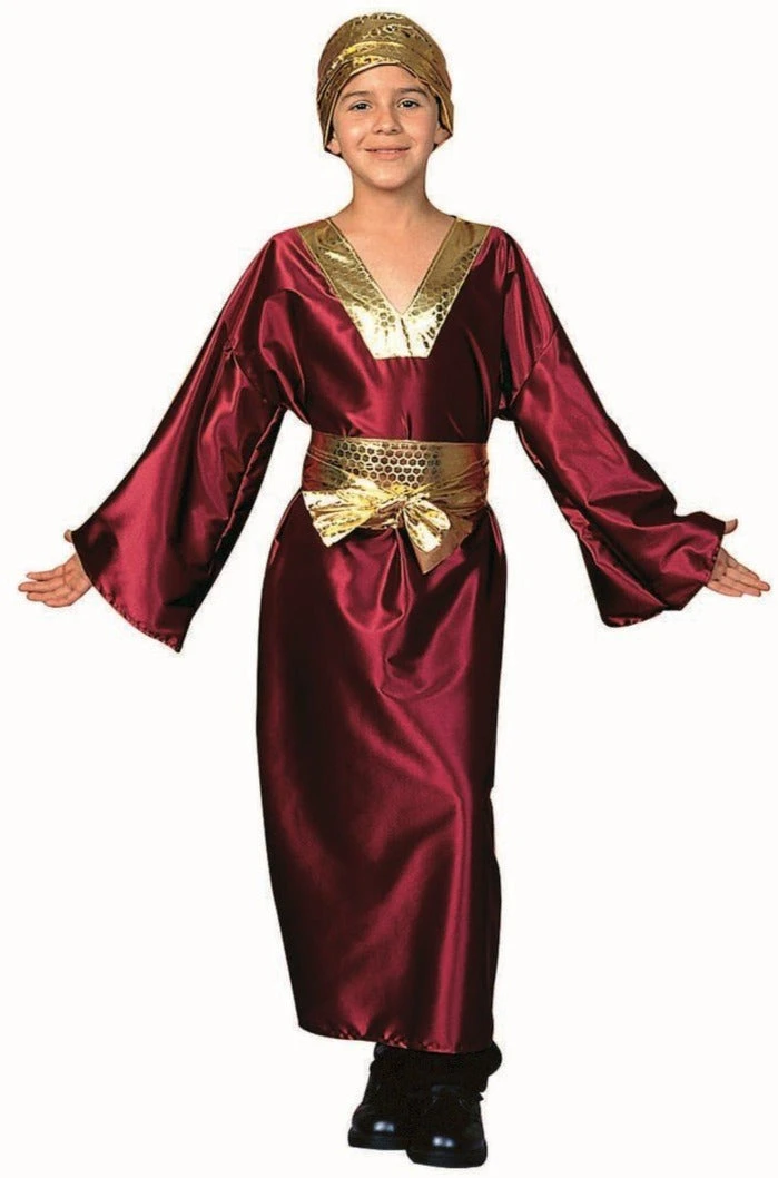 Costume Includes Long Sleeved Wine Colored Rob with Metallic Gold V-Neck Collar, Metallic Gold Belt and Matching Gold Headpiece.Â