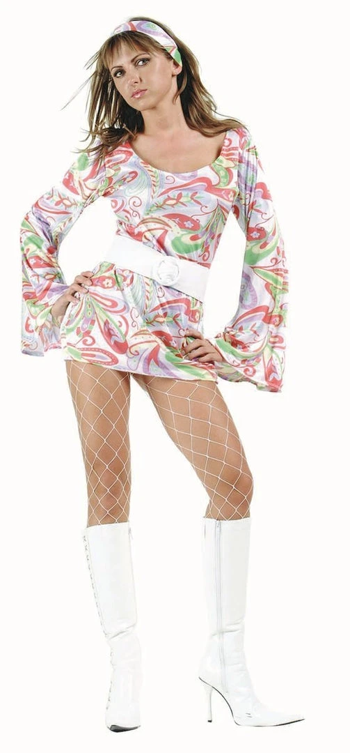 Costume Includes Colorful Mini Dress with Long Bell Sleeves and Matching Headband. *Belt and Stockings Not Included.