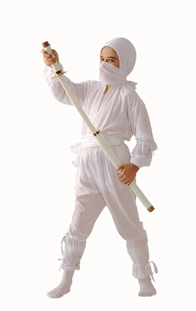 Costume Includes White Long Sleeve Shirt with Hood, White Pants, White Waist Sash and Face Scarf. Sword Not Included.