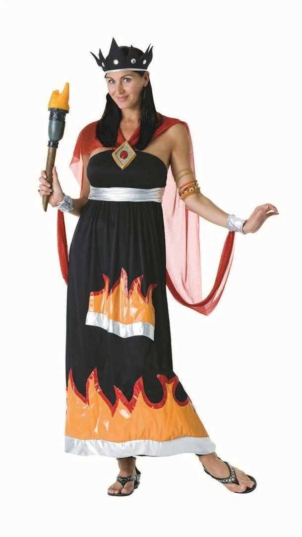 Costume Includes Black Dress with Fire Detail, Red Shoulder Hang Attaches From Front to Silver Wrist Cuffs, Silver Waist Sash and Black Crown.Â