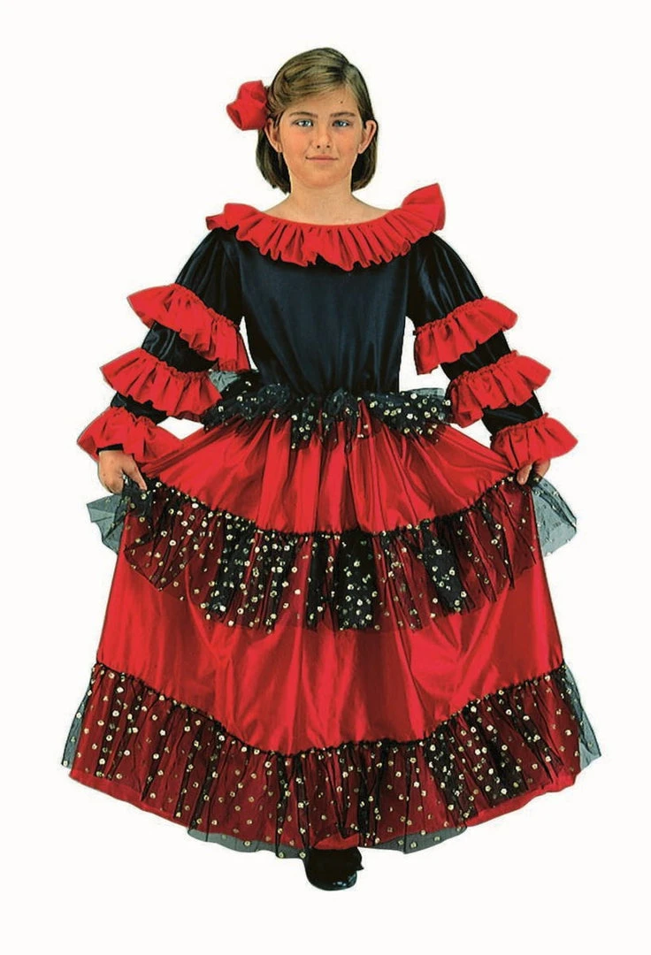 Spanish Beauty Flemenco Costume Includes Full Length Red and Black Layered Dress with Long Sleeves and Hair Rose.