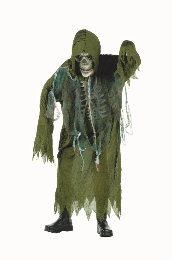 Kids Costume Includes Green Long Sleeved Layered Robe with Hood and Attached 3-D Skeleton Chest and Seperate EVA Skull Mask.