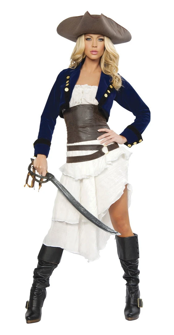Sexy Pirate Costume Includes Strapless 3-Tier Dress, Belt with O-Ring, Waist Cincher, Bolero Jacket, Hat and Sword.