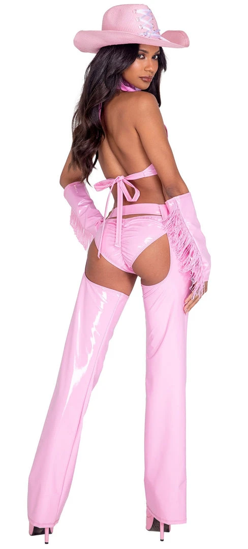 Includes Vinyl Bra Top, Shorts, Chaps, Belt, Bandana & Pair of Fringe Cuffs.