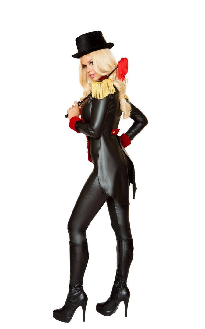 Sassy Ringleader ringmaster costume includes Catsuit with Button & Chain Detail & Attached Shoulder Pad with Fringe & Top Hat.
